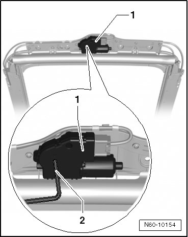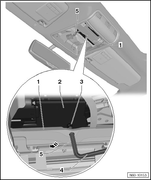 - Guide the hex wrench - 4 - through the hole in the brace - 1 - and into the screw - 3 - in the sunroof motor - 2 -.