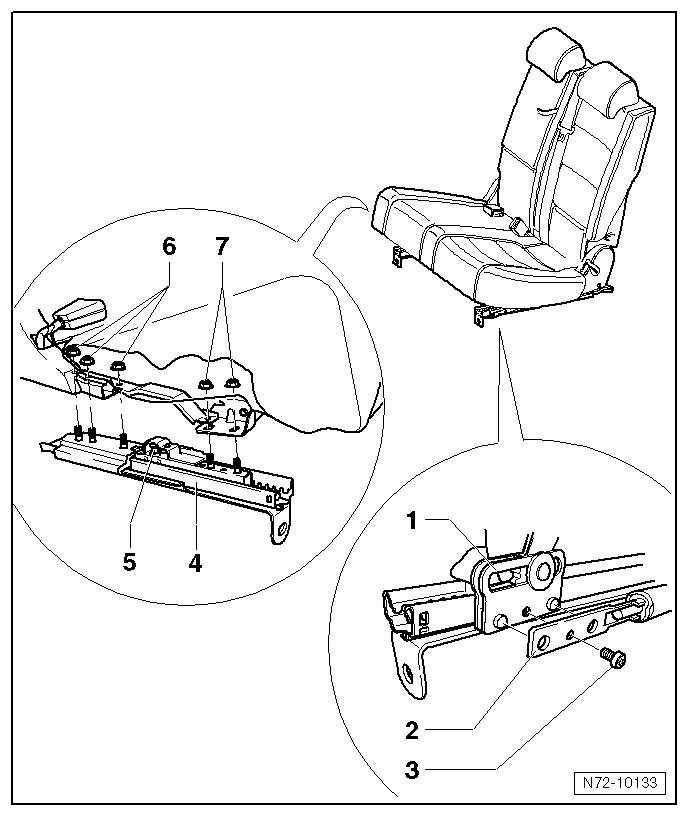 - Place the seat rail - 4 - in its installation position and tighten the nuts - 6 - and - 7 - by hand.