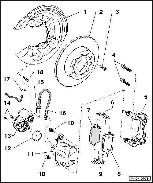 • Before removing brake caliper or disconnecting brake hose, brake pedal depressor (V.A.G 1869/2) must be inserted (this dissipates pressure).