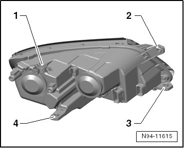 If the upper rear headlamp mount - 1 -, the lower rear headlamp mounting tab - 4 -, the front lower mounting tab - 3 - or the upper front headlamp mounting tab - 2 - are damaged or broken off, they can be repaired by installing a repair set. It is not necessary to replace the entire headlamp.
