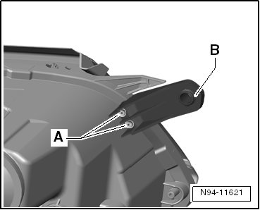 - Insert new mounting tab - B - form fitting onto mounting tab socket on headlamp and tighten the screws - A -.