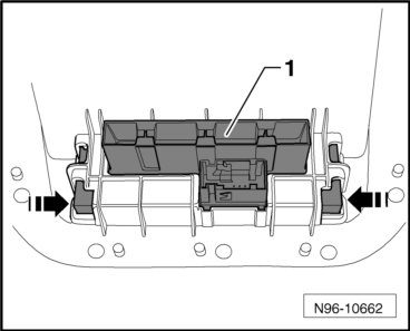 - Release both side retainers - arrows - and remove the switch module - 1 - upward from the center console.