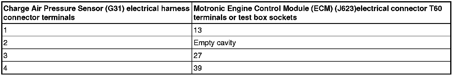 - Using a multimeter, check the Charge Air Pressure Sensor (G31) electrical harness connector terminals to the Motronic Engine Control Module (ECM) (J623)electrical harness connector T60 terminals for an open circuit according to wiring diagram.