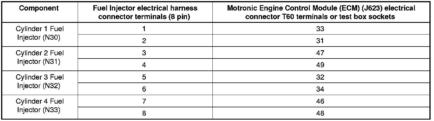 - Using a multimeter, check the Fuel Injector electrical harness connector terminals to the Motronic Engine Control Module (ECM) (J623) electrical harness connector T60 terminals for an open circuit.