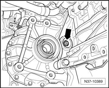 - Remove the bevel box to transmission upper bolts - arrows -.