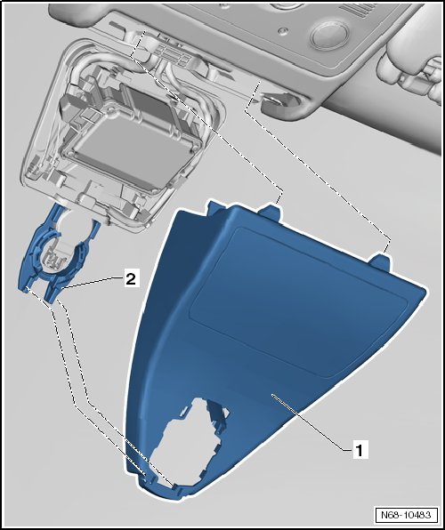 - Unclip the camera cover - 1 - in the front from the interior rearview mirror retaining plate - 2 - and tilt down.