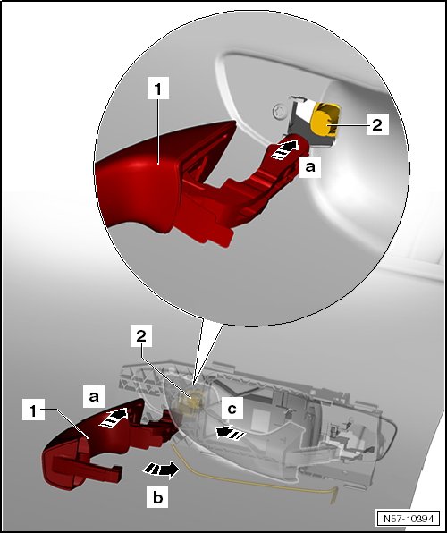 - Insert the door handle - 1 - at a right angle - arrow a - into the mounting bracket - 3 -. The access/start authorization control module harness connector - 2 - engages.