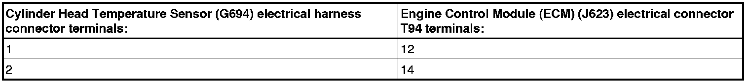 - Using a multimeter, check the Cylinder Head Temperature Sensor (G694) electrical harness connector terminals to the Engine Control Module (ECM) (J623) electrical harness connector T94 terminals for an open circuit or a short to voltage, refer to the chart below.