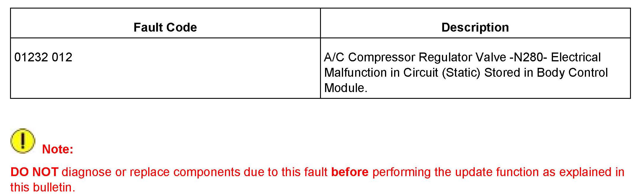 Update Programming, DTC 01232 012 A/C Compressor Control Valve N280 Malfunction in Circuit - Static