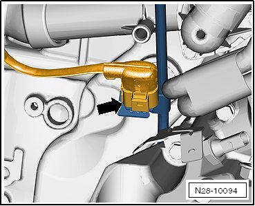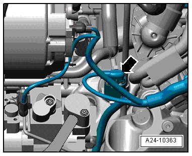 - Remove the engine speed sensor wire downward through the opening in the oil filter housing - arrow -.