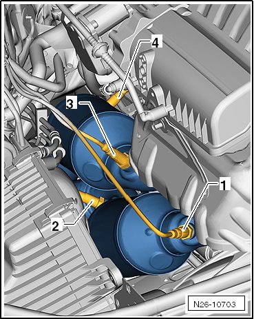 - Disconnect the hoses - 1 and 2 - and remove the connecting pipe - arrows -.