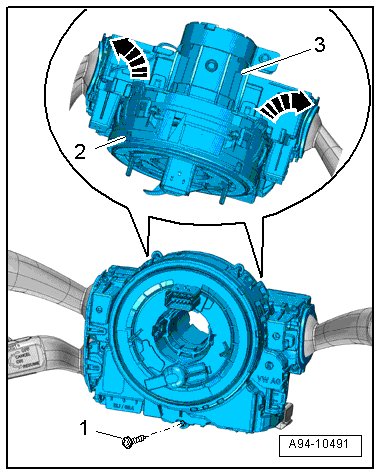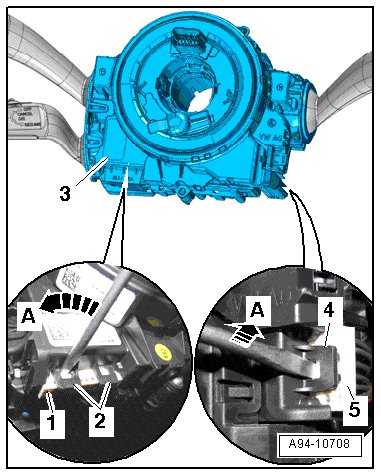 - Open the hooks - arrows - and remove the steering column electronics control module - 2 - from the steering column switch module - 3 -.