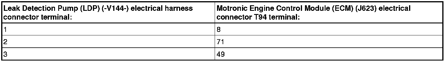 - Using a multimeter, check the Leak Detection Pump (LDP) (-V144-) electrical connector terminals to Motronic Engine Control Module (ECM) (J623) electrical connector terminals for an open circuit or high resistance.