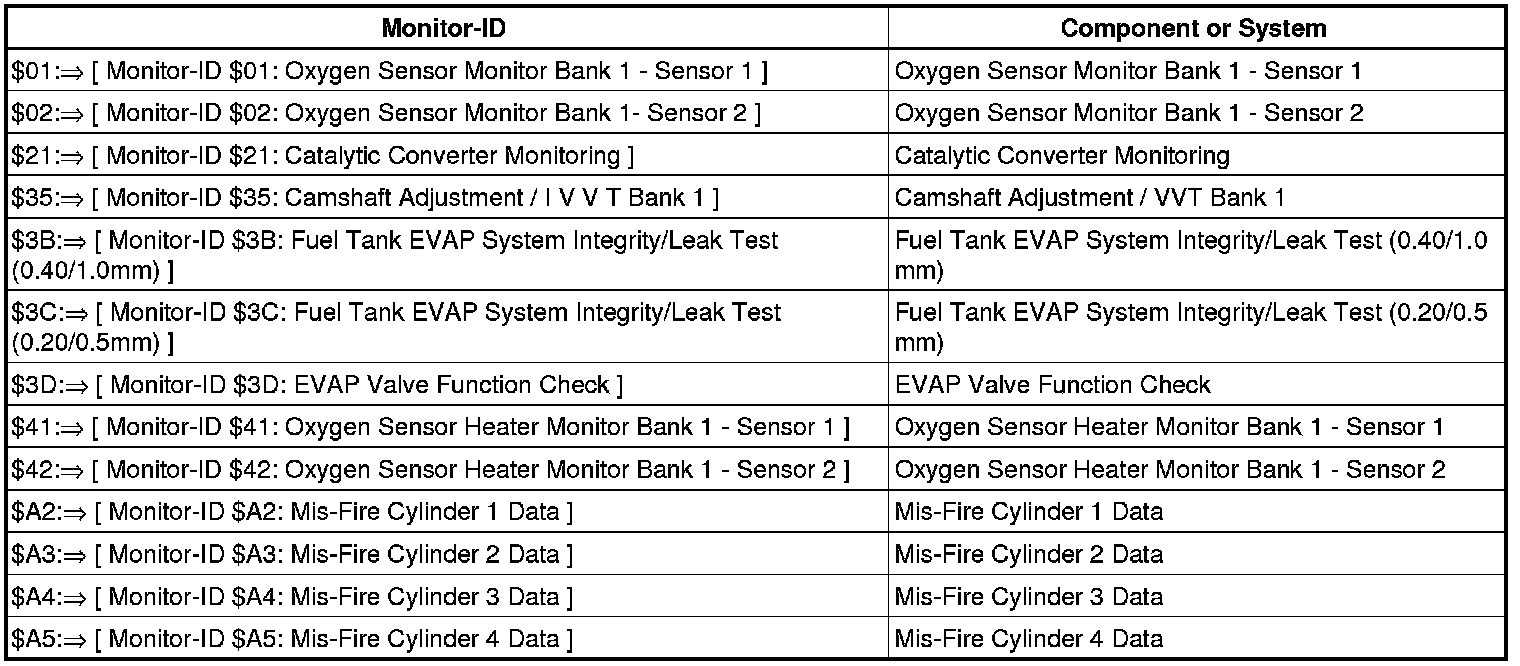 • Depending on the scan tool and protocol used, the information displayed in diagnostic mode 06 may be referred to by different names such as Test-ID (TID), Hex-ID, Component-ID (CID), or On-Board Diagnostic Monitor Identifier (OBDMID).
