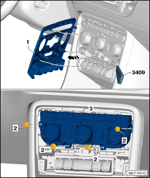 - Remove the trim - 1 - with the (3409). Refer to Storage Compartments, Covers and Trim.