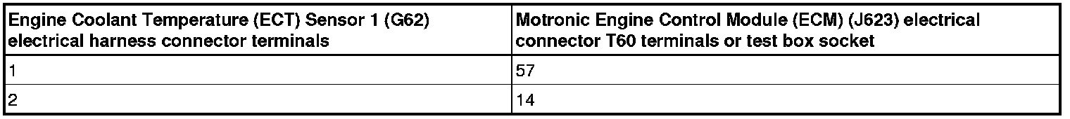 - Using a multimeter, check the Engine Coolant Temperature (ECT) Sensor (G62 or G83) electrical harness connector terminal 1 to the Motronic Engine Control Module (ECM) (J623) electrical harness connector for an open circuit or a short to voltage, refer to the chart below for the appropriate sensor. Refer to Wiring Diagrams for pin locations.