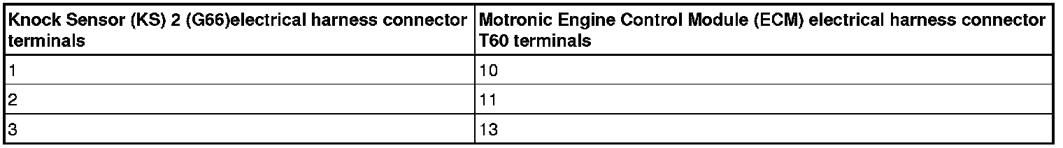 - Disconnect the Knock Sensor (KS) 1 (G61) electrical harness connector or the Knock Sensor (KS) 2 (G66) electrical harness connector.