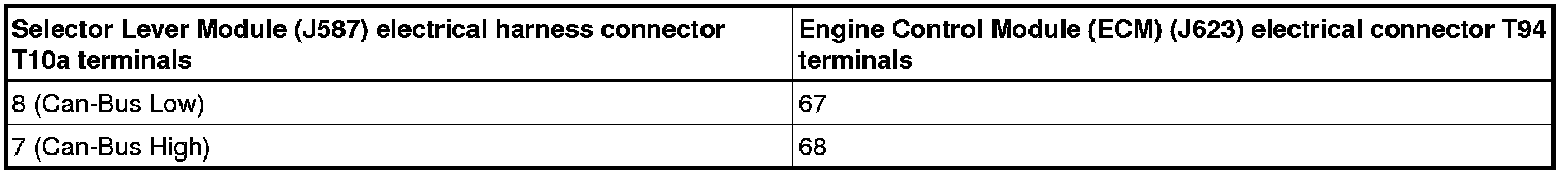 - Using a multimeter, check the Selector Lever Module (J587) electrical harness connector to the Engine Control Module (ECM) (J623) electrical harness connector T94 for resistance. Refer to Wiring Diagrams.