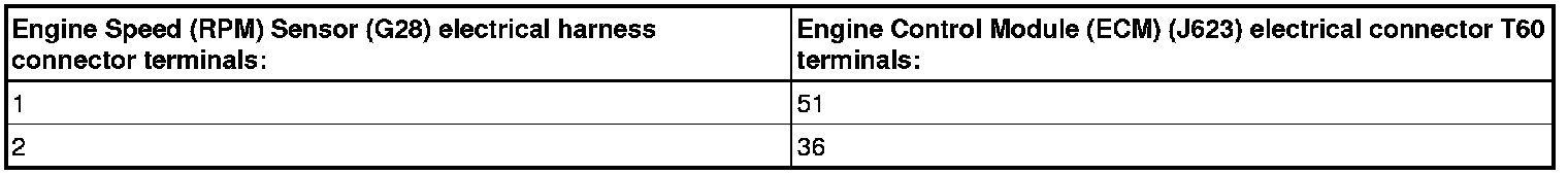 - Using a multimeter, check the Engine Speed (RPM) Sensor (G28) electrical harness connector terminals to the Engine Control Module (ECM) (J623) electrical harness connector terminals for an open circuit.