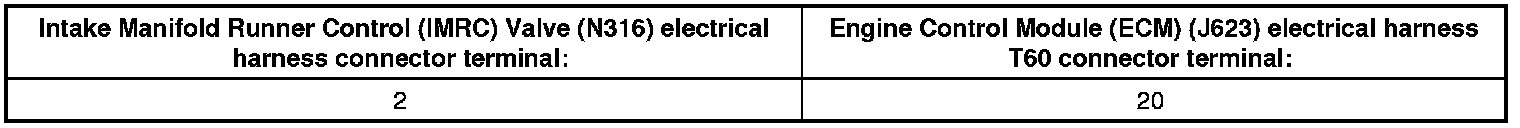 - Using a multimeter, check the Intake Manifold Runner Control (IMRC) Valve (N316) electrical harness connector terminal to the Engine Control Module (ECM) (J623) electrical harness connector terminal for resistance.