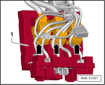 - Release both latching mechanisms - arrows - and remove the relay carrier - 1 - in the - direction of the arrow - from the vehicle electrical system control module - 2 -.