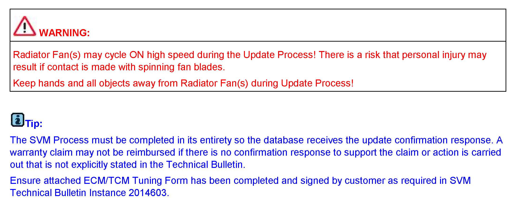 The SVM Process must be completed in its entirety so the database receives the update confirmation response. A warranty claim may not be reimbursed if there is no confirmation response to support the claim.