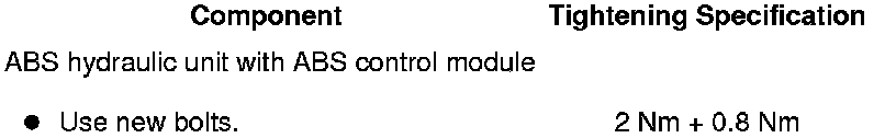 - Install the ABS hydraulic unit and the ABS control module with the new screws provided diagonally and in steps to the tightening specification.