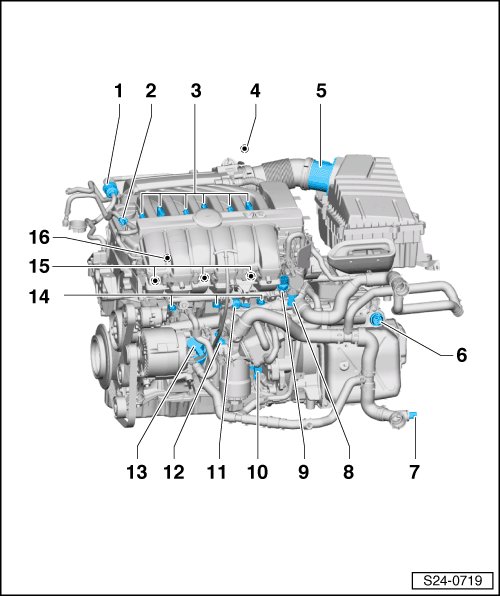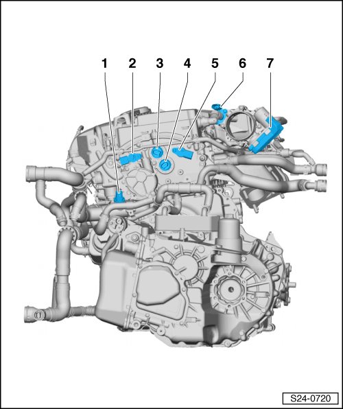 • Component location, see - item 23 - in the => [ Coolant Pump/Thermostat Overview ] Coolant Pump/Thermostat Overview.