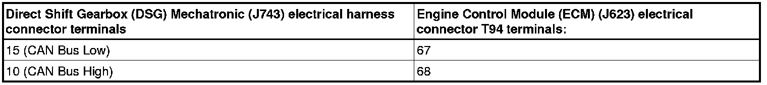 - Using a multimeter, check the Direct Shift Gearbox (DSG) Mechatronic (J743) electrical harness connector to the Engine Control Module (ECM) (J623) electrical harness connector T94 for resistance.