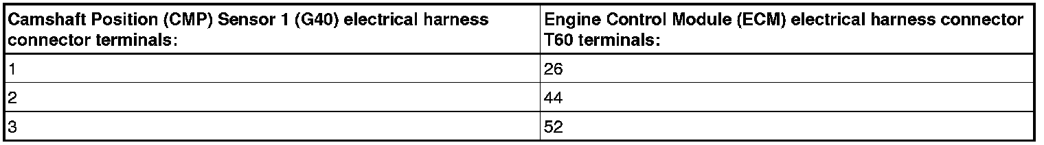 - Using a multimeter, Check the Camshaft Position (CMP) Sensor 1 (G40) or Camshaft Position (CMP) Sensor 2 (G163) electrical harness connector to the Engine Control Module (ECM) electrical harness connector T60 for an open circuit.
