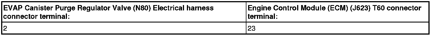 - Using a multimeter, check the EVAP Canister Purge Regulator Valve (N80) electrical connector terminal to the Engine Control Module (ECM) (J623) electrical connector T60 for resistance.