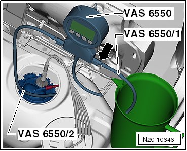 - Connect the pressure tester (VAS 6550) with the hose (VAS 6550/2) to the flange. Hold the other hose (VAS 6550/1) in a measuring container.