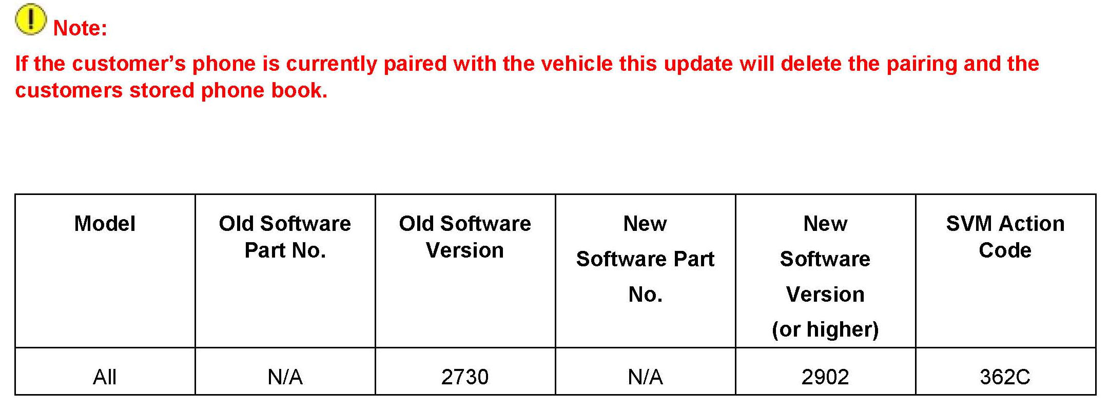 ^ Update the Bluetooth Control Module using the SVM Unit code as listed in the table below: