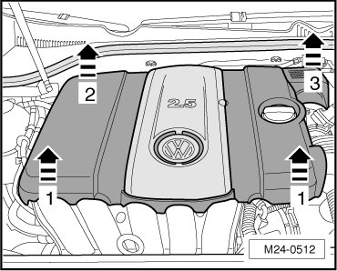 - Remove the engine cover from the fasteners first at the front - arrow 1 -, then at the rear on the right side - arrow 2 - and finally at the rear on the left side - arrow 3 - with a quick pull.