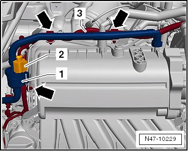 - Remove the coolant pipe - 1 - from the cylinder head - arrows - and move it to the side.