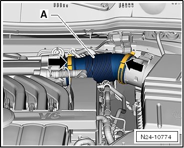 - Open the clamps - arrows - and remove the connecting pipe - A -.