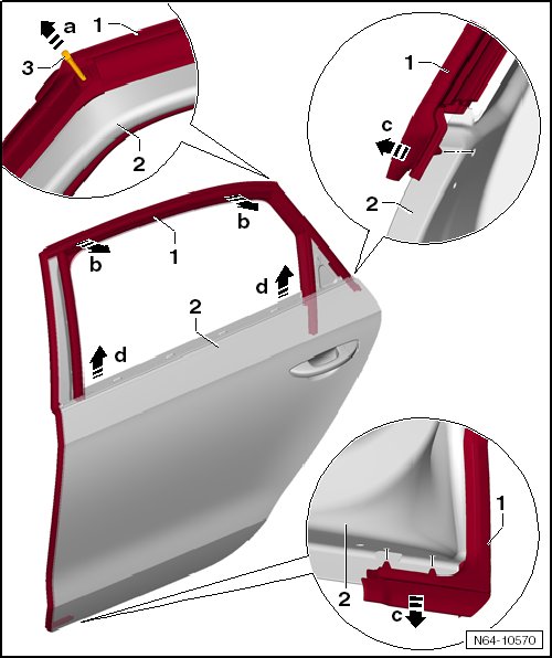 - Fold up the sealing lip on the window guide from the inside starting from the B-pillar up to the door flange - arrow d -.