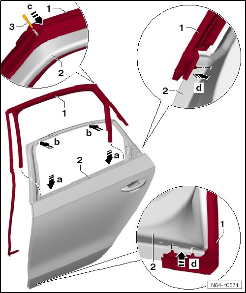 - Insert the corner of the C-pillar at the top - arrow c -. Push the window guide - 1 - onto the door flange - arrow b - at the same time.