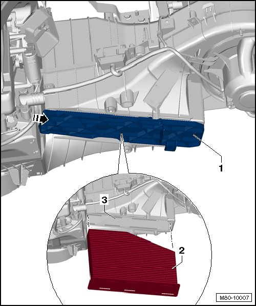 - Remove the dust and pollen filter -2- from the housing shaft -3-.