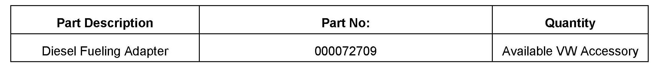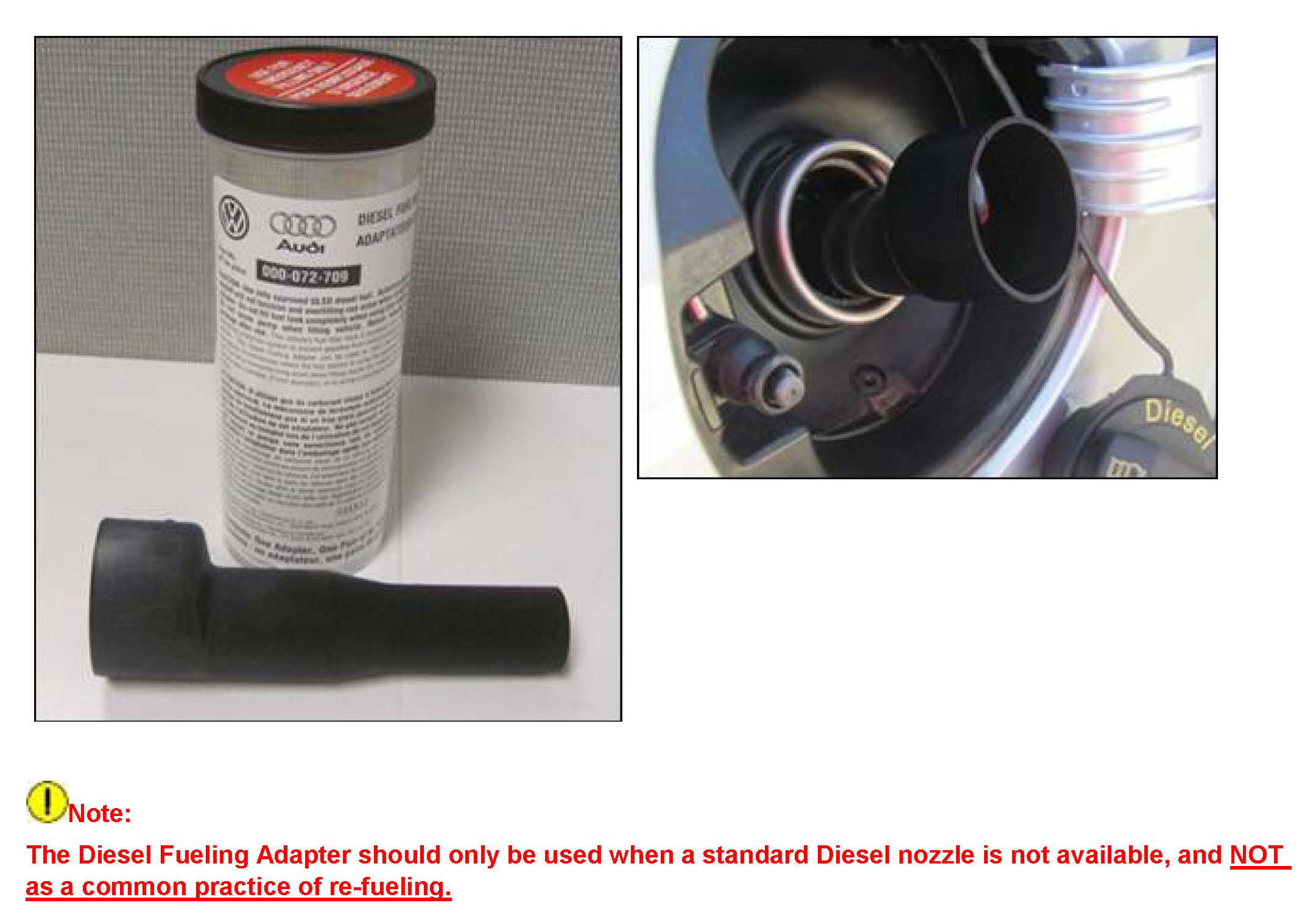 To prevent a customer from being unable to re-fuel in an area where a standard 24mm Diesel filler nozzle is not available, Volkswagen has released a "Diesel Fueling Adapter" P/N 000072709 to allow re-fueling with either the 21mm Gasoline or the 30mm high capacity Diesel nozzles.