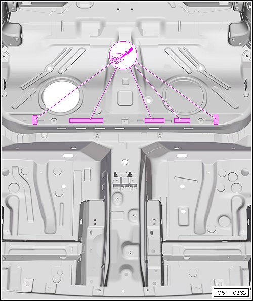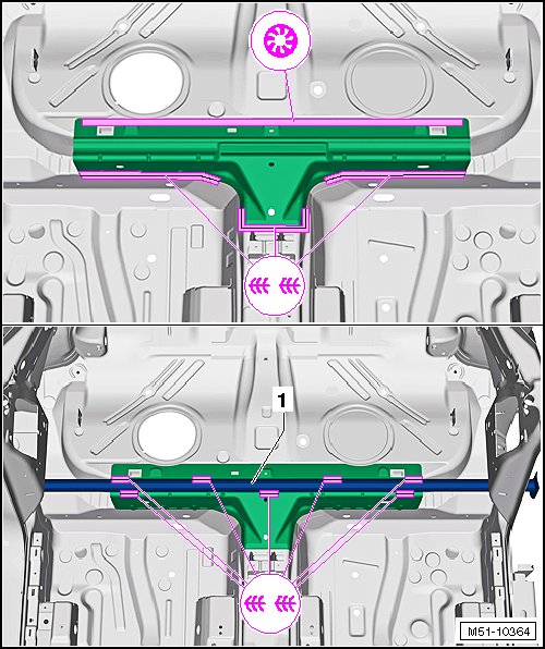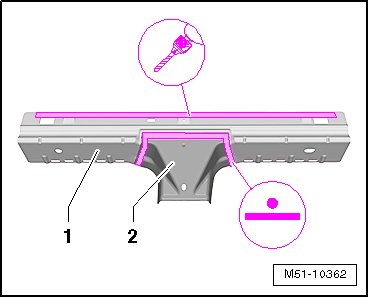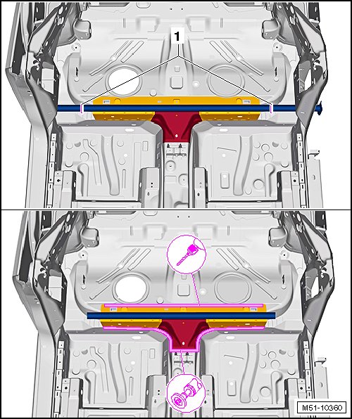 - Weld the double floor panel - 1 - to the tunnel reinforcement - 2 - with a straight-line spot weld seam.