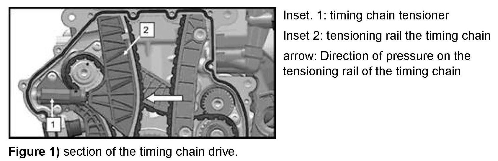 If the piston of the timing chain tensioner can be compressed in by hand (Figure 2, red arrow) the timing chain tensioner has failed, and further engine diagnosis may be required.