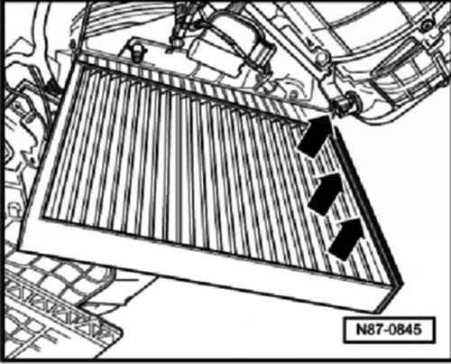 The dust and pollen filter with activated charcoal filter element is located in the front passenger footwell.