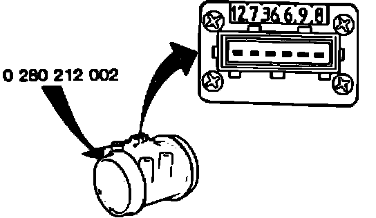 The air mass meter for above model year has an aluminum housing. The housing is marked with Bosch Part Number 0 280 212 002. Connector configuration is as illustrated.