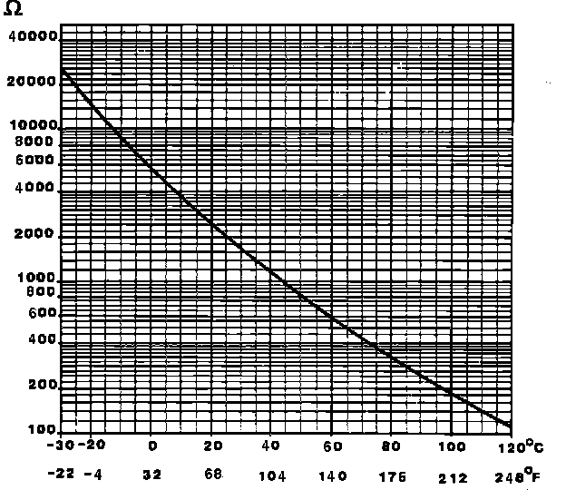 6. Check temperature sensor by connecting an ohmmeter between ground and ECU connector pin 2.