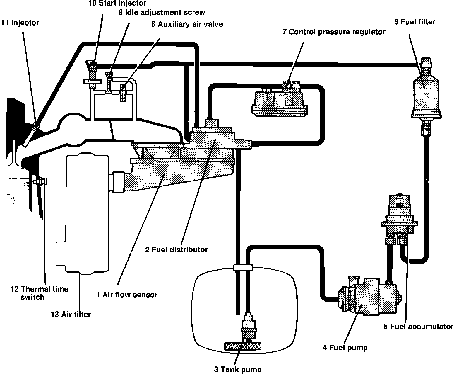 This system, Fig. 1, continuously measures the air flow into the engine and uses this information to control the amount of fuel supplied to the engine. Incoming air and fuel flow are regulated by the air flow control unit which consists of the air flow sensor and the fuel distributor.