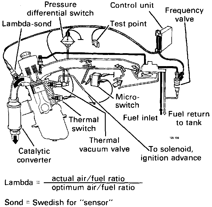 GeneralThis is a self-adjusting engine control system designed to reduce emissions and improve fuel economy. An exhaust gas sensor, (oxygen sensor, also called Lambda sensor, or Lambda Sond) monitors the oxygen content of the exhaust gases leaving the engine. The exhaust gas analysis is fed into a closed loop feedback system. This continuously adjusts the air-fuel ratio to provide optimum conditions for combustion and efficient elimination of all three of the major pollutants (hydrocarbons, carbon monoxide and oxides of nitrogen) by a 3-way catalytic converter.