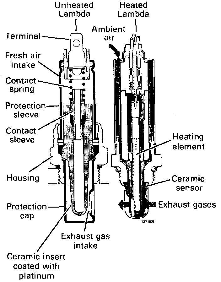 Measurements are taken by a ceramic sensor in the Lambda Sond. It produces a small voltage (90 - 100 mV) in proportion to the difference between the oxygen content of the exhaust gas and the oxygen content of the ambient air. Exhaust gases heat up the sensor which begins to operate at 350°C = 660°F. In some models the oxygen sensor may not heat up quickly enough to the operating temperature of (350°C - 660°F) due to lower exhaust gas temperatures. This means some Lambda Sonds are heated by an electric element. Heated Lambdas are found on the following engines: late 1984 B23F, and all B230F.