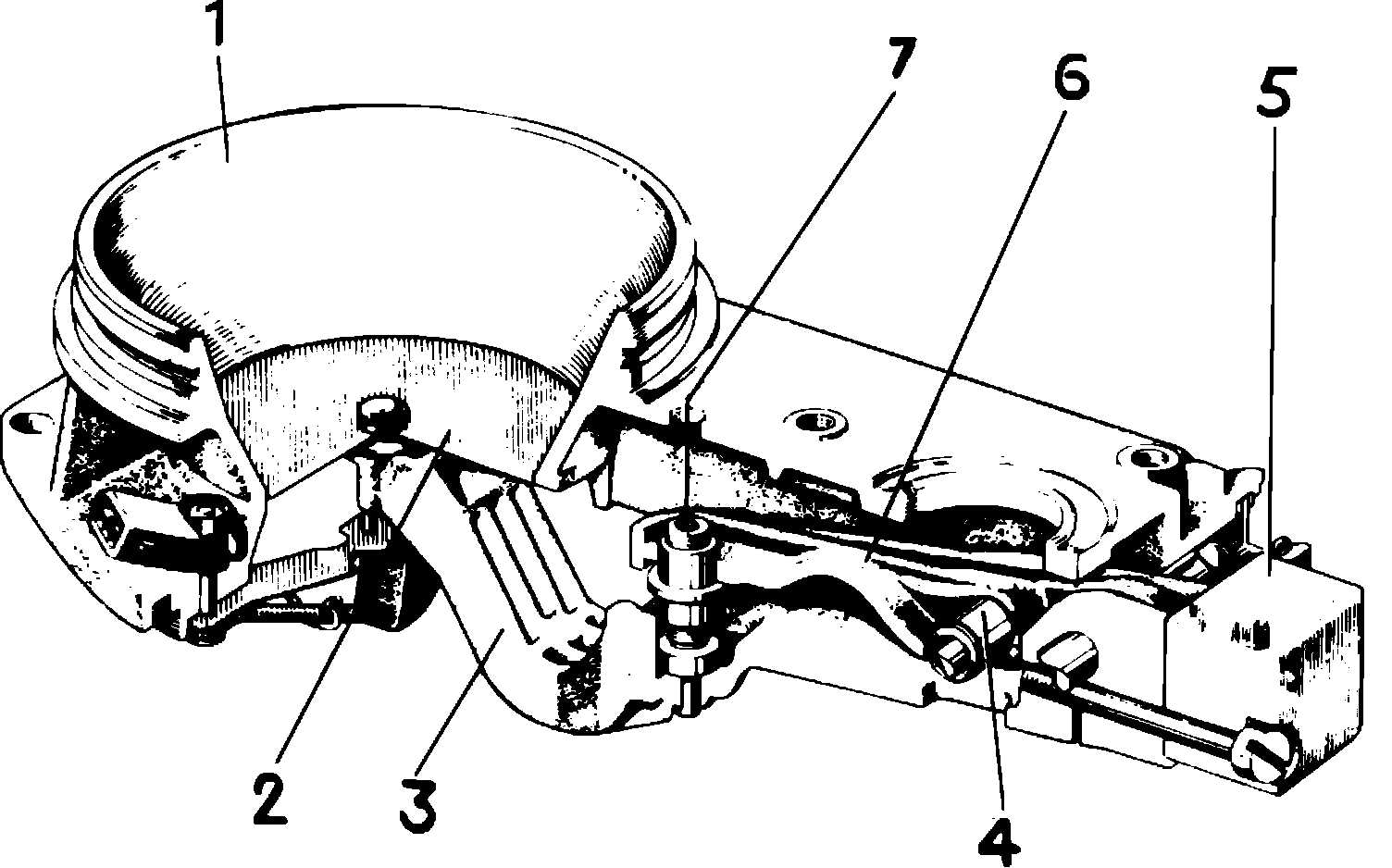 The air flow sensor, Fig. 2, continuously measures air flowing into the engine and transmits this information to the fuel distributor. The air flow sensor consists of an air venturi (1) and an air flow sensor plate (2) which moves in the venturi. The plate is attached to a lever (3) which transmits the movement of the plate through a flange (4) to the control plunger in the fuel distributor. The weight of the sensor plate and lever is counterbalanced by a counterweight (5). The adjustment screw (7) is attached to a lever (6) and is used to adjust CO level.