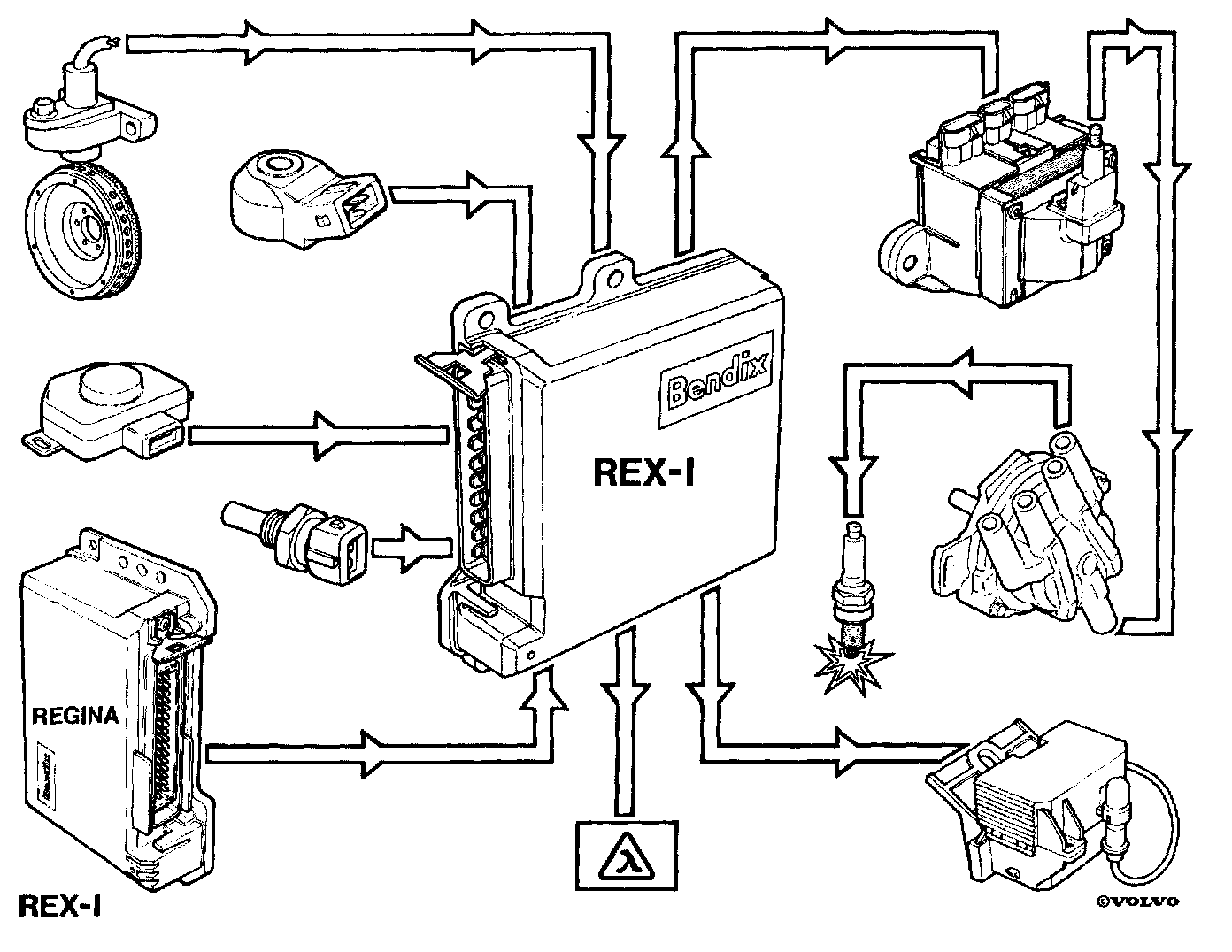 Rex-I receives information regarding load from Regina's control unit. At high load (a large volume of fuel/air) the ignition is retarded. If the load is subjected to rapid change, the ignition setting is retarded significantly for all cylinders to prevent knocking.